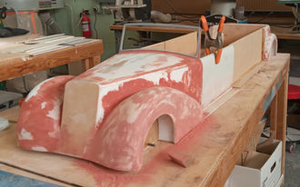 Using a design draft and reference photos of real cars, I started by constructing the main structure with MDF and carving the curved mudguards from foam. I then refined the surfaces with epoxy before handcrafting all the details. The stunning paint job was done by the talented artists from the scenic department and model shop.